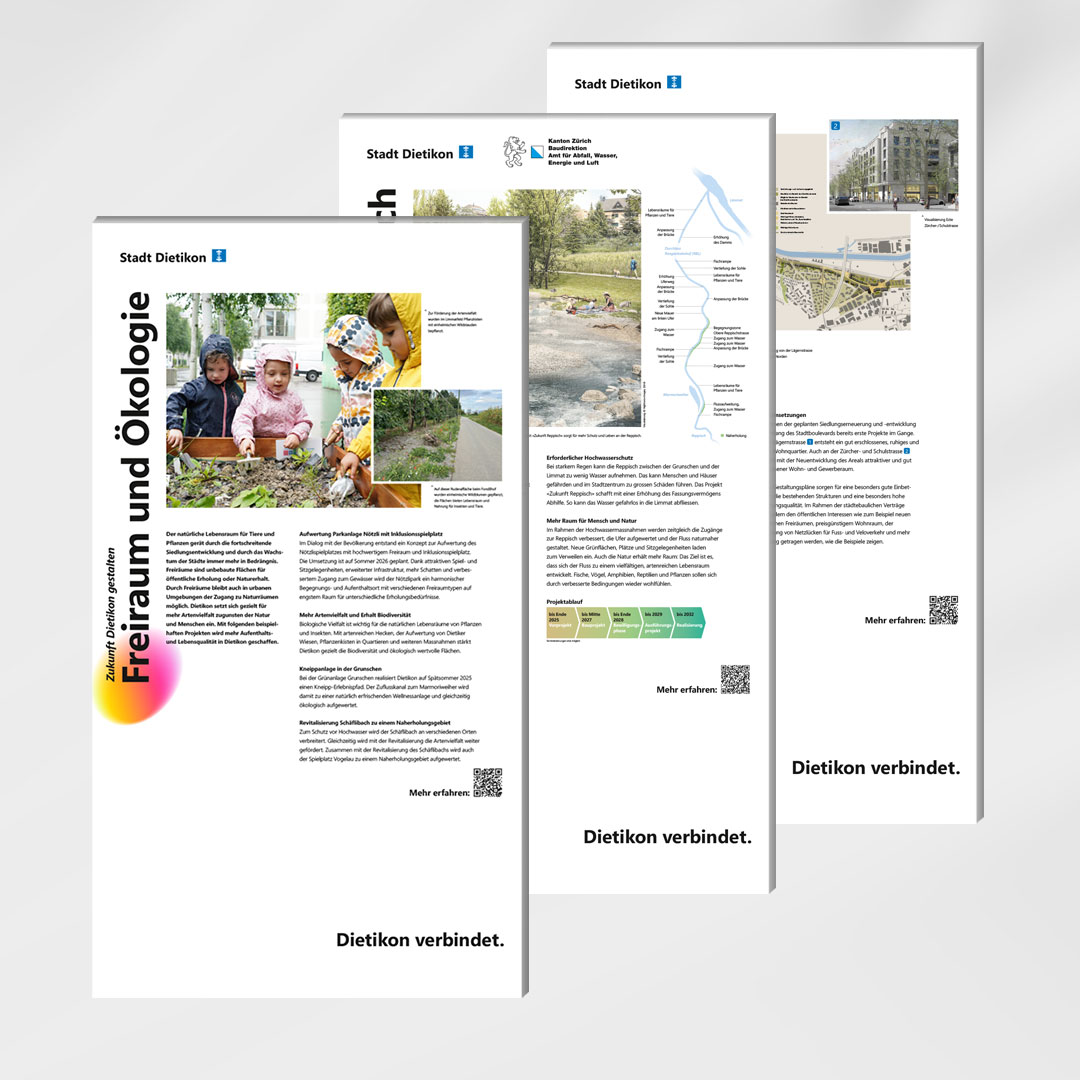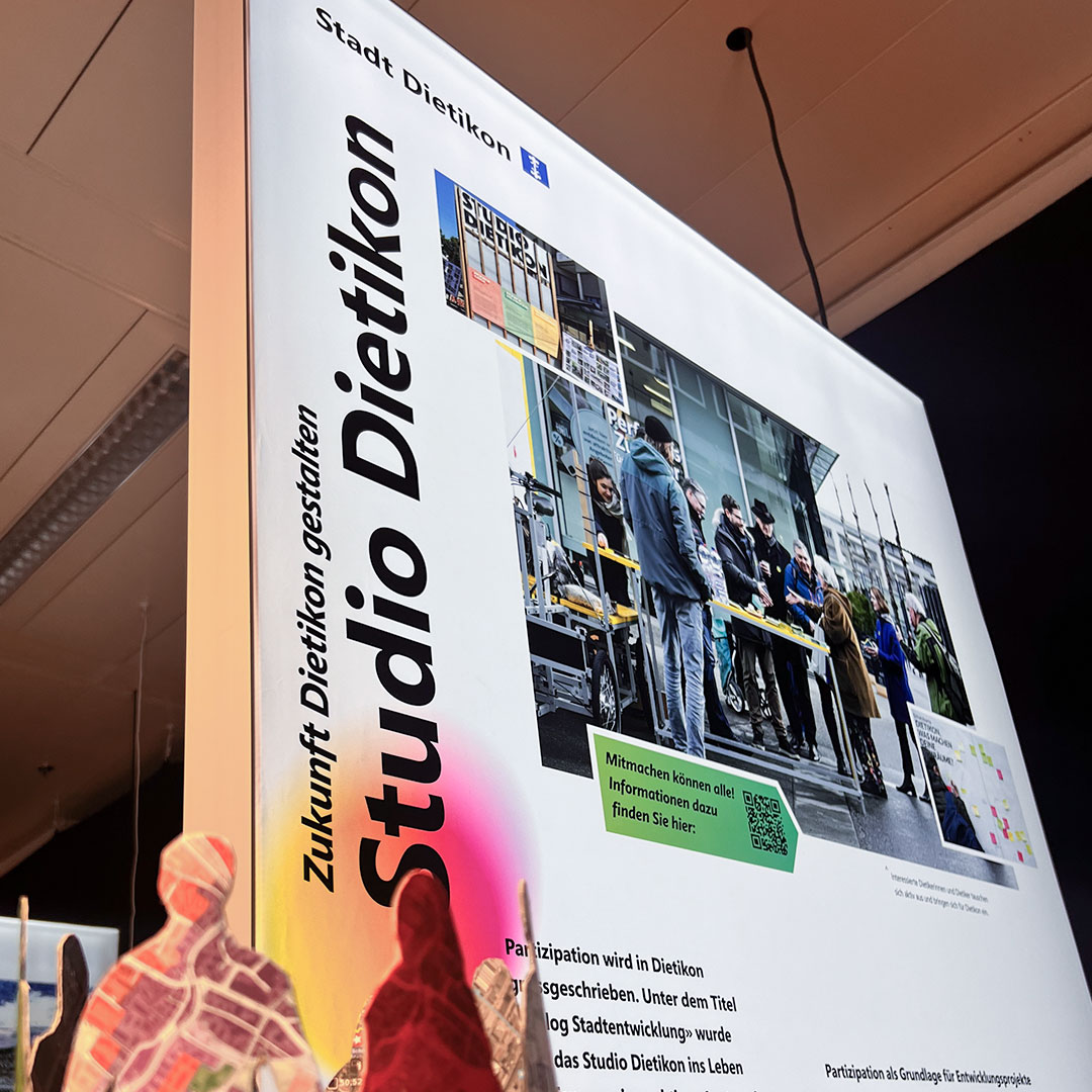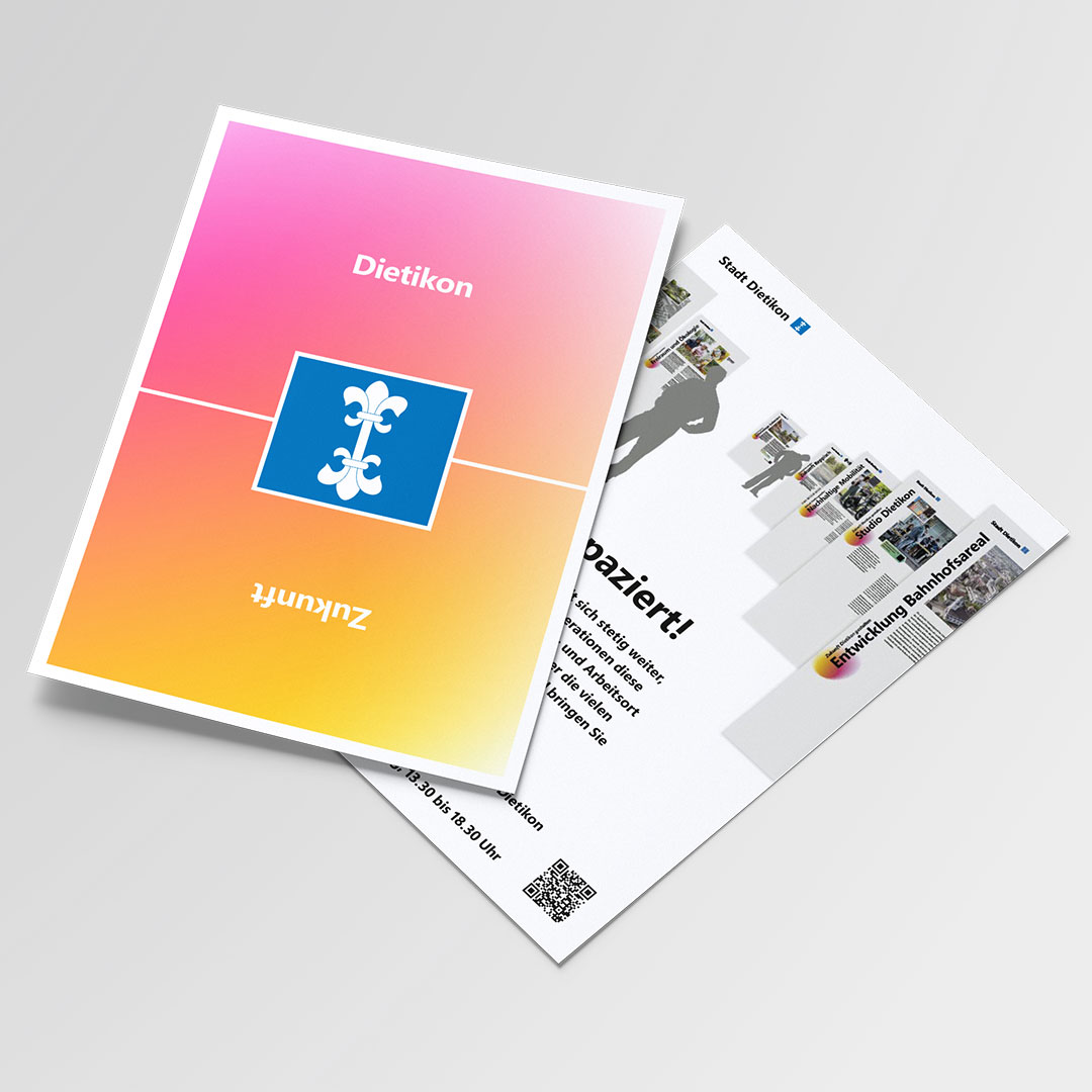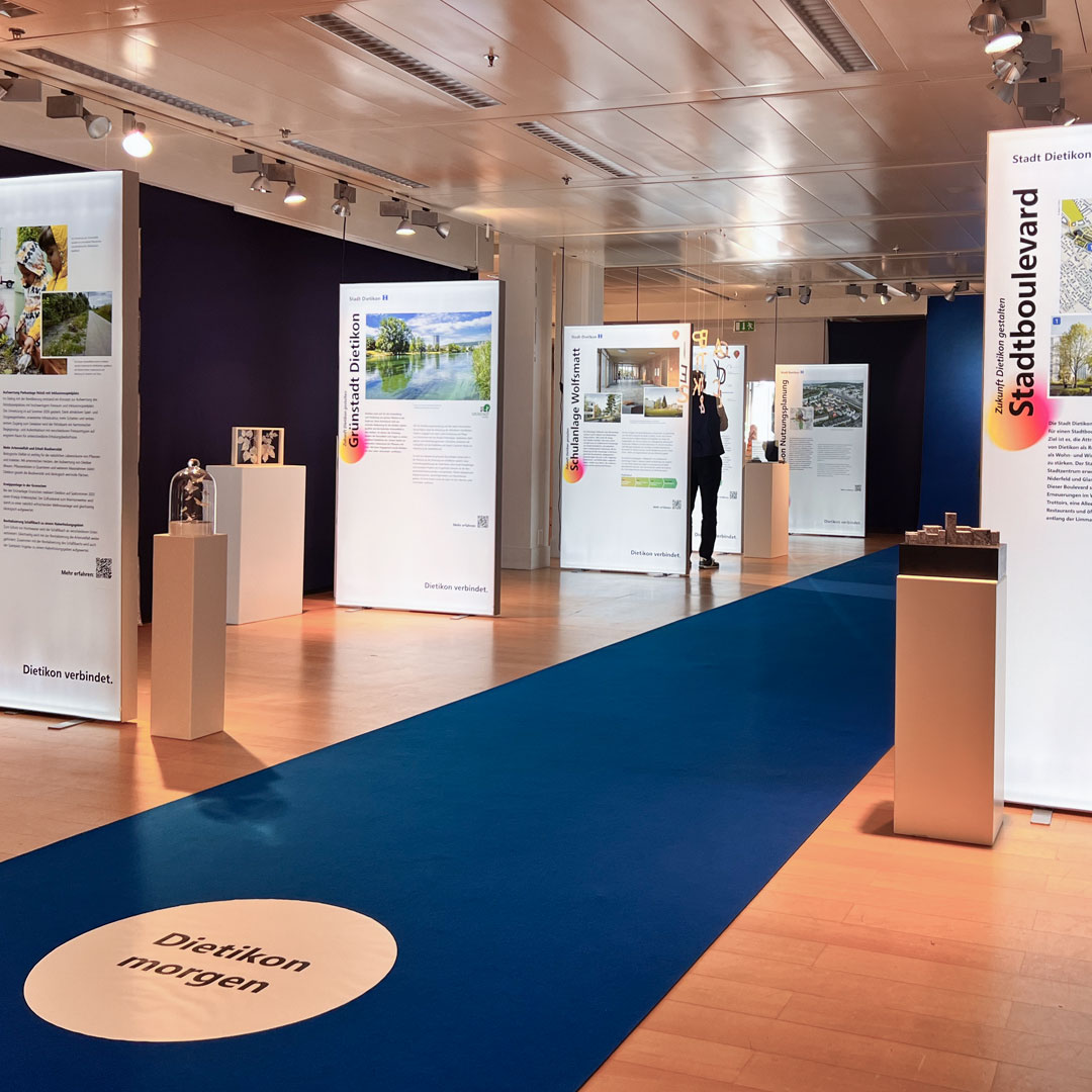 Im Auftrag der Stadt Dietikon gestaltete KOMMPAKT die Ausstellung «Dietikon heute und morgen» im Forum für Stadtentwicklung, Innovation und Kultur. Ziel war es, die städtebauliche Vision der Stadt erlebbar zu machen und aktuelle sowie zukünftige Projekte anschaulich zu präsentieren. Zentrale Elemente der Ausstellung waren grossformatige Stelen, die einzelne Entwicklungsprojekte wie das Niderfeld, den neuen Bahnhofplatz oder das Arbeitsplatzgebiet Silbern visuell und inhaltlich zugänglich machten. Ergänzend dazu konzipierten und produzierten wir begleitende Kommunikationsmittel – darunter Flyer, Plakate und eine Broschüre –, die den Besucherinnen und Besuchern einen vertieften Einblick in die geplanten Vorhaben ermöglichten.
